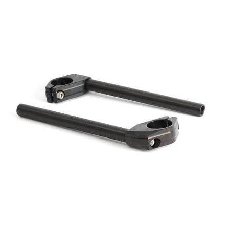 Gilles GPL2 50mm Clip On Handlebars - Black Anodised The New Gilles GPL2 Clip Ons Handlebar is an evolution from the GPL handlebar. Designed for track or fast road use with a fixed angle of 6 degrees. They weigh in at just 670g. Features: Extremely lightweight handlebar (approx. 670 g) Engraved marking for alignment with the fork Separate screw fastening for clamping to the fork tube. The purpose of this is to avoid distortion of the fork tube in the event of an accident The handlebar's screw fastening is located on the outside of the clamp, which enables quick replacement of the handlebar without the need for a special wrench The overall length of the handlebar is 255.5 mm 22.2mm outer diameter A fixed 6 ° slope is the optimal compromise between sporty and comfortable riding position Also available in Raw Alloy Silver finish