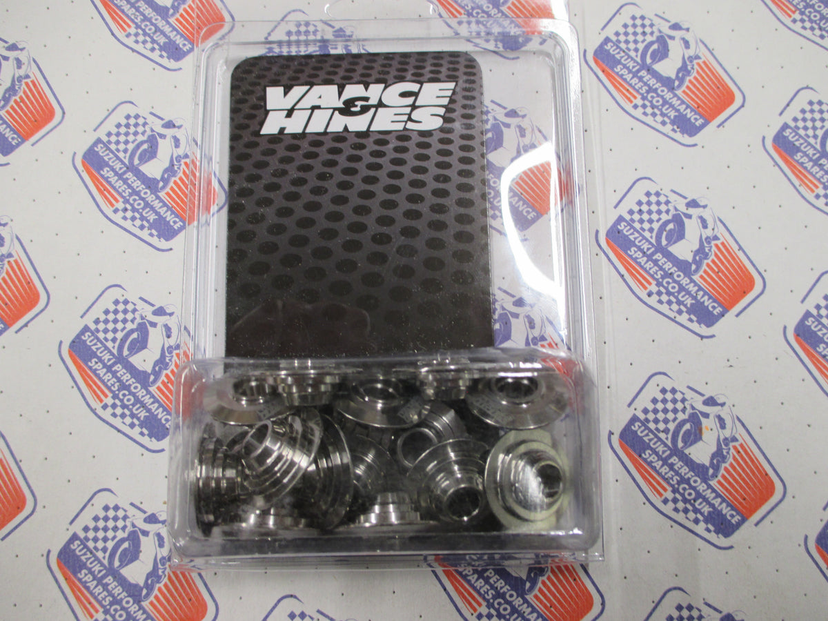 Vance & Hines Titanium Retainers Suzuki GSX1300R The Vance & Hines GSX1300R Titanium Retainer Set is made of 6AL4V Titanium and is engineered and tested for extreme conditions. The lightweight titanium retainers Provide less valve bounce at high RPM and maintain durability. The set includes 16 titanium retainers as a stock replacement. Features: Made from 6AL4V Titanium Engineered and tested to perform under the most extreme conditions Titanium retainers are the lightest in the industry Proven to have less valve bounce at high RPM without sacrificing durability Stock Replacement Set comes with 16 Titanium Retainers