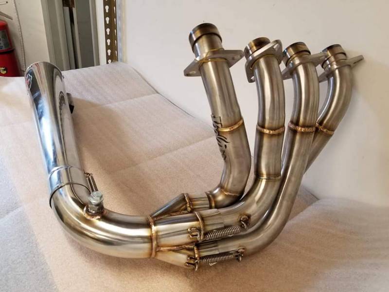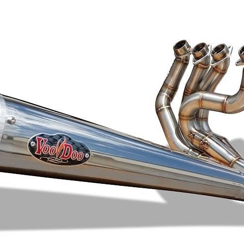 Kawasaki ZX14R 06-19 Voodoo Stainless 4-1 Sidewinder Drag Race Exhaust system. VooDoo Sidewinder Exhaust 4 Inch diameter stainless steel megaphone with removable 2.5 inch baffle (Entire system weighs 12 lbs. with baffle installed) Includes stepped headpipes, O2 sensor bung, removable billet end cap, baffle assembly ALL mounting hardware Exhaust clears stock oil pan filter, however to maximize clearance combine a VooDoo Sidewinder with an aftermarket oil pan (not included with kit). Billet Block-Offs are included for the removal of the Oil Cooler, required on Suzuki models. First Generation 99-07 Hayabusa require P.A.I.R Block-Off (sold separately as part # VPVBUSAJ9 for 99-07 VPVBUSAK8 for 08-19 Hayabusa). P.A.I.R. Block-Off not mandatory for 08-19 Hayabusa, 06-19 ZX14, 01-16 GSXR1000 however it does reduce backfire during deceleration. Restricts right hand cornering clearance Fairing modifications are required, templates included VMEC (Voodoo Megaphone End Cap) available in many color choices sold separately