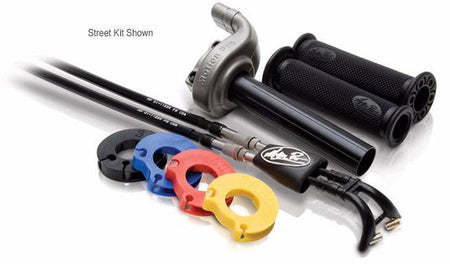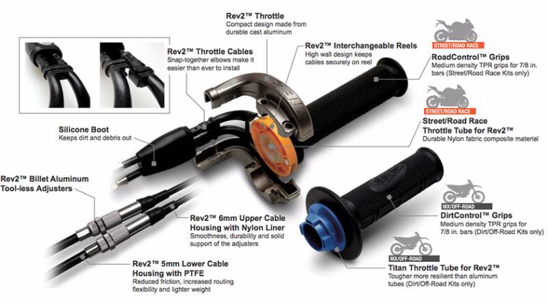Motion Pro revolver 2 is the second generation of their innovative reel changing system, which lets you tailor the throttle rate to riding conditions and rider preference. New ultra compact housing with snap together elbows makes it easy to install and change reels. Sleek new design requires less handlebar space for lever clearance and throttle position. The different reels included allow you to have faster or slower throttle rates compared to standard.Included cam wheel also allow a Progressive throttle response preferred by some riders. The cables feature billet inline adjusters for ease of adjustment and the cables are PTFE lined for smooth easy action.