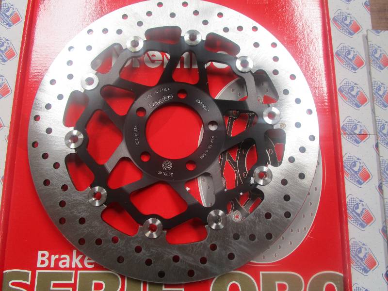 Description Brembo Serie Oro upgrade replacement brake discs are extremely high quality Product Description Manufactured from Brembo's own formula, high carbon stainless steel for outstanding friction coefficiency Very high operating temperature range Suitable for road or Track use Direct replacement for original equipment Lightweight hard anodised black alloy carrier Anti vibration washers built into bobbins Sold singularly - price per disc Technical Specifications:310mm external diameter 64mm internal diameter 86mm pitch circle diameter 10.5mm mount bolt hole diameter 5mm thick