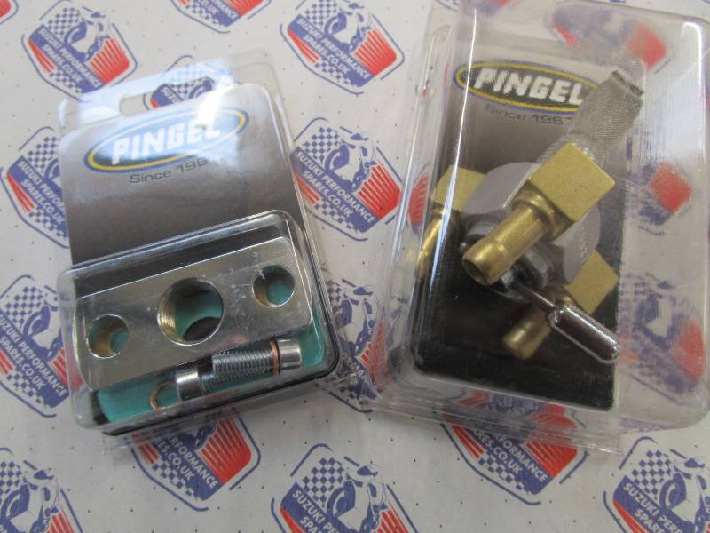Triple outlet Pingel fuel tap for the Suzuki GT750. complete with the tank adaptor. 44mm Bolt Spacing.