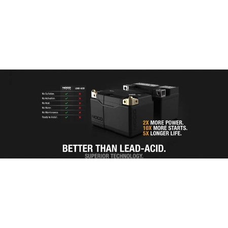 NOCO powersports lithium battery NLP14 NOCO powersports lithium battery. Better than lead-acid powersport batteries in almost every way - no sulfation, no activation, no acid, no maintenance, and no water needed. Designed to withstand 50,000 start cycles and 2,000 charge cycles. Better than lead-acid powersport batteries in almost every way - no sulfation, no activation, no acid, no maintenance, and no The most highly-designed and engineered lithium powersport battery series ever. Dynamic BMS - An advanced battery management system that Provides maximum safety Protection with bi-directional active cell balancing for long-lasting reliability. Plus, no BMS reset is needed. Superfast Charging - Unleash the power of lithium and quickly recharge within minutes. Utilizing the most advanced rapid-charge technology, it Provides enough starting power with just 5-minutes of charge. Universal - A multi-terminal configuration that allows front, side, top, and female installations. Plus , modular trays fit various group sizes and a removable mounting block to accommodate legacy battery applications. Replaces battery sizes : BTZ10S, BT12A-BS, BTZ12S, BTX12-BS, BTZ14S, BTX14, BTX14-BS, BT14B-4, BTX16-BS, BTX16-BS-1, B16A-AB, BTX20CH-BS, ETX12, ETX14, ETX14L, GYZ16H, HYB16A-AB, YTZ10S, YTX12, YTZ12S, YT12A-BS, YTX12-BS, YTX14, YTX14-BS, YTX14H, YTZ14S, YTX14H-BS, YTX16-BS, YTX16-BS-1, YTX20CH, YTX20CH-BS, and KMX14-BS. YTZ10S, YT12A-BS, YTZ12S, YTX12-BS, YTZ14S, YTX14, YTX14-BS, YT14B-4, YTX16-BS, YTX16-BS-1, B16A-AB, YTX20CH-BS, YTX12, YTX14, YTX14L, GYZ16H, HYB16A-AB, YTZ10S, YTX12, YTZ12S, YT12A-BS, YTX12-BS, YTX14, YTX14-BS, YTX14H, YTZ14S, YTX14H-BS, YTX16-BS, YTX16-BS-1, YTX20CH, YTX20CH-BS, and KMX14-BS. Dimensions: Length: 149mm Width: 87mm Height: 200.5mm CCA: 500 Polarity: +/- Type: Lithium Voltage: 12V
