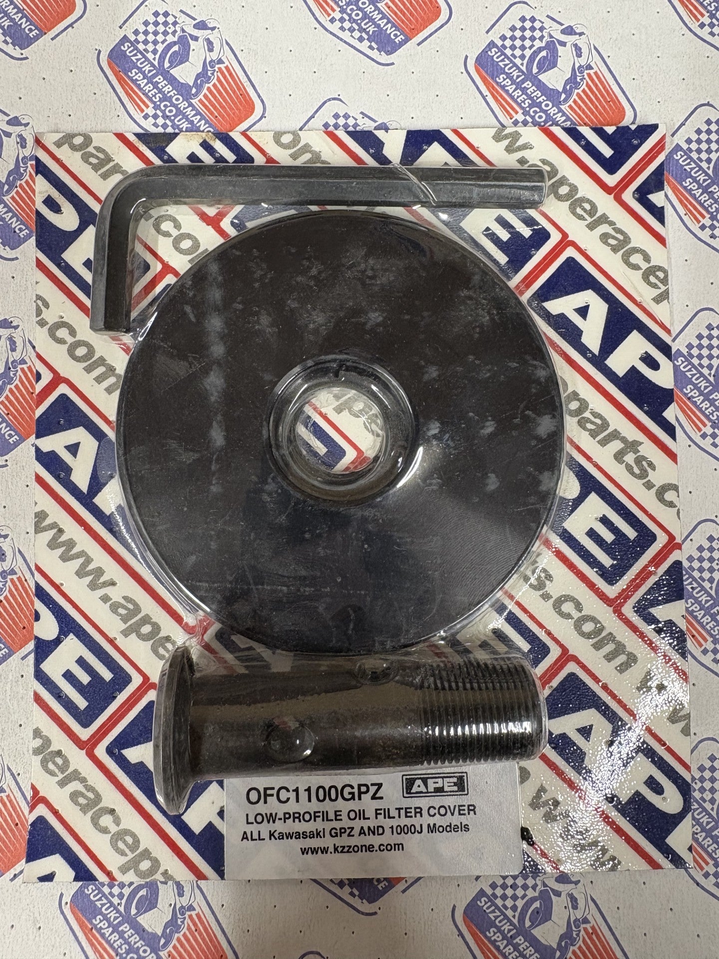 APE Low Profile oil filter cover kit from APE for the 1100GPZ and 1000J models. It Provides maximum clearance under the bike. the kit comes complete with the plate, a special oil filter bolt and allen wrench to fit.
